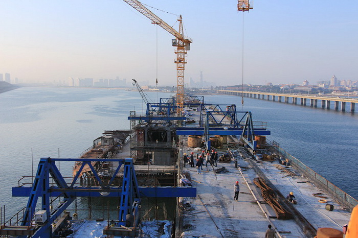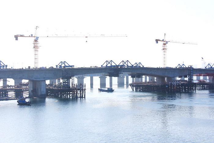 2014年12月30日,高集海堤開(kāi)口改造工程公路橋橋梁掛籃施工最后一個(gè)節段混凝土澆筑完成,宣告主橋順利合龍!