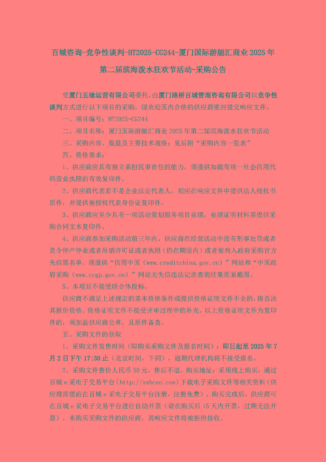 百城咨詢(xún) -競爭性談判 -HT2025-CG244-廈門(mén)國際游艇匯商業(yè) 2025 年第 二屆濱海潑水狂歡節活動(dòng)-采購公告